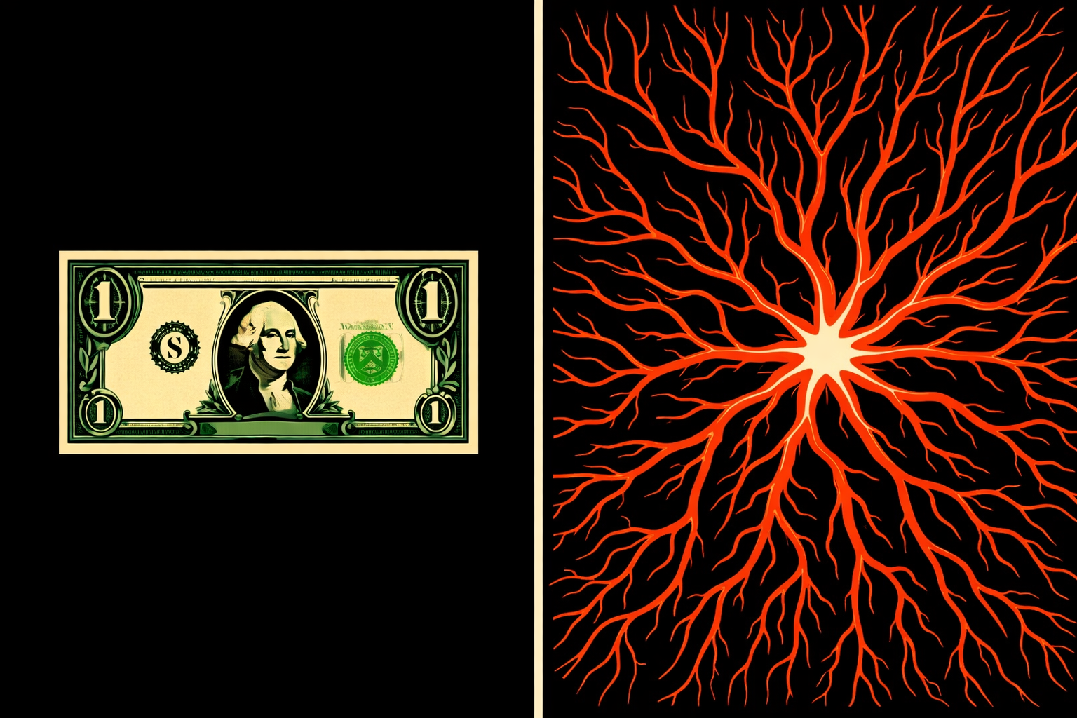 Split screen flat graphic illustration. Left side: a single dollar bill. Right side: red branching data streams, nerve-like, radiating outward from a single point. Bold black outlines, high contrast, black background. No text.