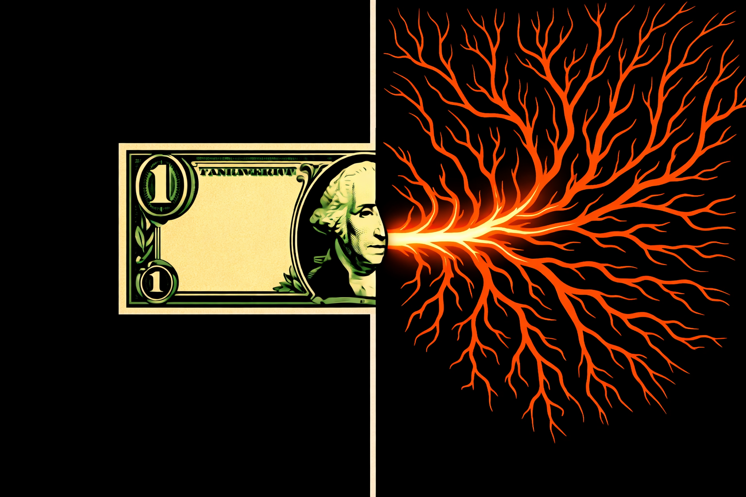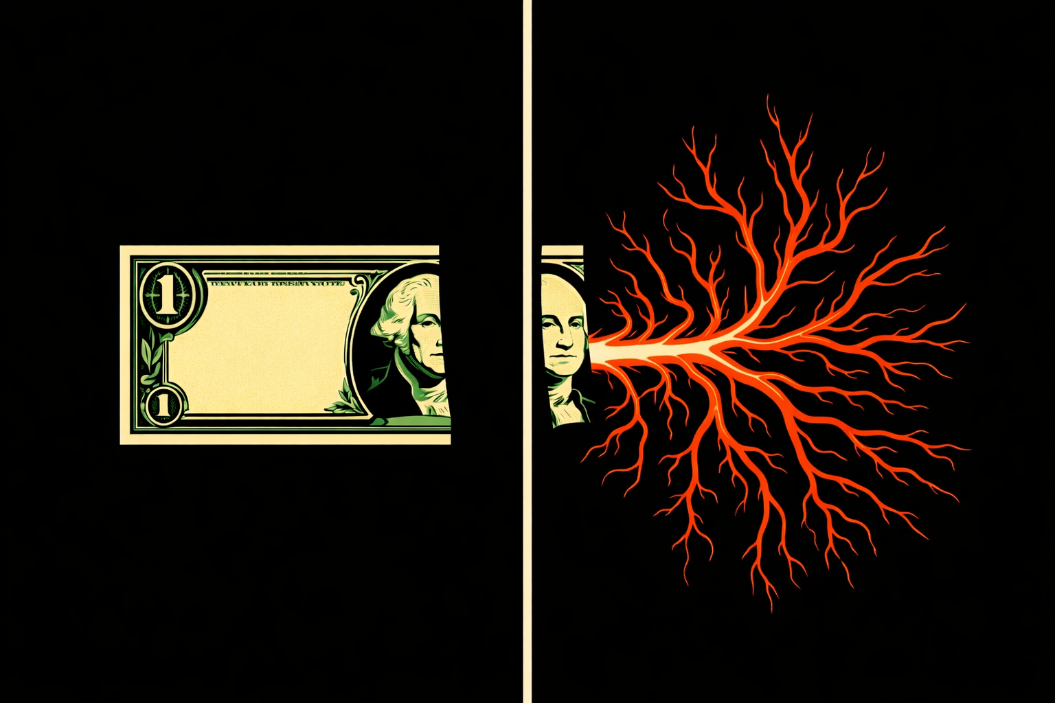 Just to confirm: you want a strict vertical split. Left side only: the left half of a dollar bill, cut off at the center line, with George Washington's face pressed right up against the split. Right side only: no bill at all — the red branching data streams begin exactly at that split point, as if radiating from where the cut-off half-face ends. Should the right side stay entirely abstract, or do you want the branching origin to subtly echo the shape of Washington's missing half-face before turning into streams?